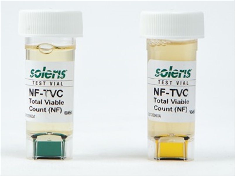 La fiala NF-TVC è uno screening generale per la conta totale di batteri vitali e può essere utilizzata per il monitoraggio delle specifiche o per i test di sterilità in prodotti alimentari, nutraceutici e cosmetici/per la cura della persona. La fiala ha un'ampia inclusività e un tempo di analisi di 22 ore per la maggior parte delle applicazioni. Man mano che i microrganismi crescono nel brodo, l'anidride carbonica (CO2) prodotta diffonde attraverso uno strato di membrana in un tampone di agar morbido contenente un colorante indicatore. Il cambiamento di colore del colorante viene letto dallo strumento. Lo strato di membrana nella fiala funge da barriera, eliminando l'interferenza del prodotto con la finestra di lettura. In uno studio del Performance Tested Method SM License # 071203 dell'AOAC Research Institute, la fiala Soleris NF-TVC si è rivelata una procedura efficace per la determinazione semiquantitativa della conta aerobica totale nei seguenti tipi di campioni: pollo crudo, prosciutto crudo, lattuga, mandorle, pepe nero, cheesecake, preparato per gelato, latte scremato in polvere e cacao in polvere. La durata del test è di 24 ore, ad eccezione del cacao in polvere, che dura 27 ore.NF-TVC